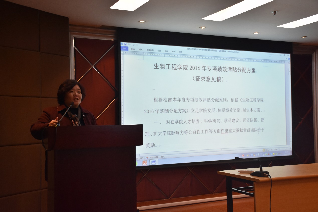 2016年11月29日,学院在实验18楼召开学院教代会代表会议,通报并讨论《bevictor伟德国际19462016年专项绩效津贴分配方案》(征求意见稿)(以下简称《专项津贴分配方案》)。30多位代表到场,工会主席蔡海波主持会议,学院党委书记陆兵、院长庄英萍到场并解释《专项津贴分配方案》。