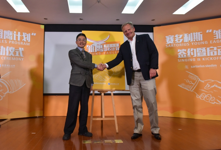 接下来Joerg Lindenblatt先生和陆兵书记分别致辞,共同提出了雏鹰培养计划的愿景。随后Joerg Lindenblatt和陆兵分别代表双方签署了雏鹰培养计划协议书。紧接着主持人对雏鹰计划的具体内容进行了详细的介绍。最后,伟德国际1946校友、赛多利斯销售总监王逢以及产品应用支持经理任雪芸,从自身经历出发,向同学们分享了职场心得体会并回答大家的提问。