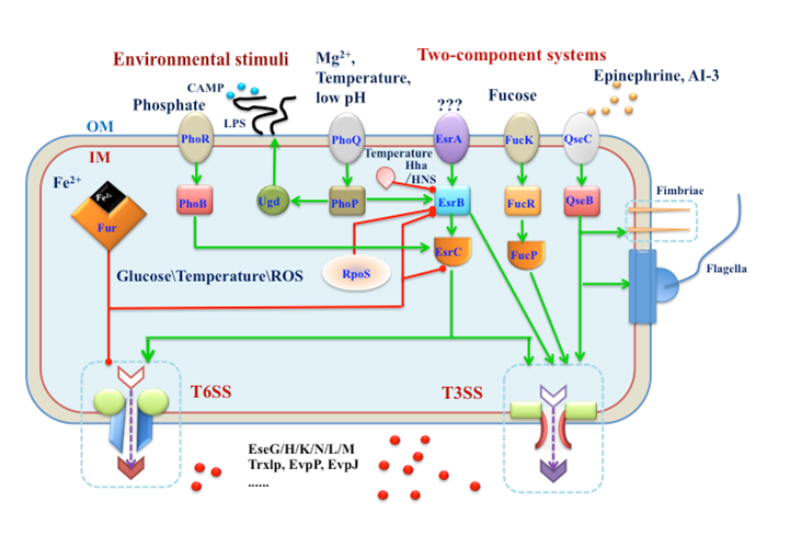 围绕着海水养殖业主要病害,我校相关课题组紧扣“病原菌如何感知水产养殖环境和鱼类宿主生理变化并进行条件致病”主题,较为系统研究了相关病原菌感知包括温度、渗透压、pH、盐离子等鱼体内、外多种理化和生理信号变化并协调其中主要毒力系统T3SS和T6SS等表达和相关效应蛋白分泌的分子机制(图2),基本阐明造成鱼类病害发生的机理,并进行了减毒活疫苗的理性分子设计,相关研究成果发表在《iScience》、《Proceedings of the National Academy of Science of the United State of America》、《PLoS Pathogens》、《mBio》、《Environmental Microbiology》和《Virulence》等主流期刊,并获得多项国家发明专利授权和国家一类新兽药证书,相关疫苗产品也获得产业化应用,推动了我国海水养殖鱼类免疫防治体系的构建。