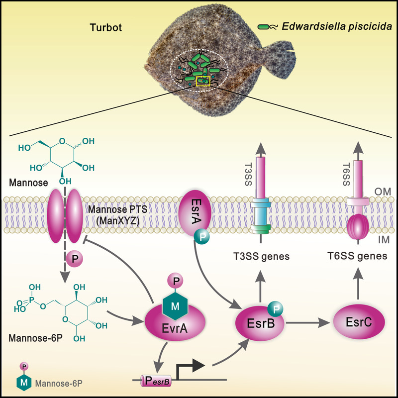 糖代谢是为生物体生长提供能量的的基础代谢之一。病原菌往往一方面利用糖代谢生产ATP,促进生长繁殖;另一方面利用糖代谢过程产生的代谢物作为信号分子,调控代谢过程和毒力系统表达,从而促进感染过程。从杀鱼爱德华氏菌野生毒株出发,本论文首先利用mariner家族转座子构建了一个插入位点确定的杀鱼爱德华氏菌突变株文库(Defined transposon insertion mutant library)。利用该文库和转座子插入测序技术在不同培养基、巨噬细胞以及大菱鲆条件下对生长/定植相关的条件必需基因进行系统筛选,发现在该菌中甘露糖代谢显著影响其在鱼体内的定植。本论文进一步研究发现,爱德华氏菌通过其编码的甘露糖PTS (磷酸烯醇式丙酮酸转移酶)系统,感知环境中存在的甘露糖,并将其磷酸化生成甘露糖-6磷酸,并转运至胞内(图1)。体内的一种新型转录调控因子EvrA能直接与甘露糖-6磷酸结合并受其调控,增强与DNA结合能力,激活由EsrB和EsrC介导的三型分泌系统(T3SS)和六型分泌系统(T6SS)的表达,进而调控杀鱼爱德华氏菌在宿主体内的定植过程,并造成系统性感染(图1)。该研究首次报道病原菌通过感知环境中的甘露糖调控毒力系统表达,为水产养殖病害防控技术开发提供理论指导。