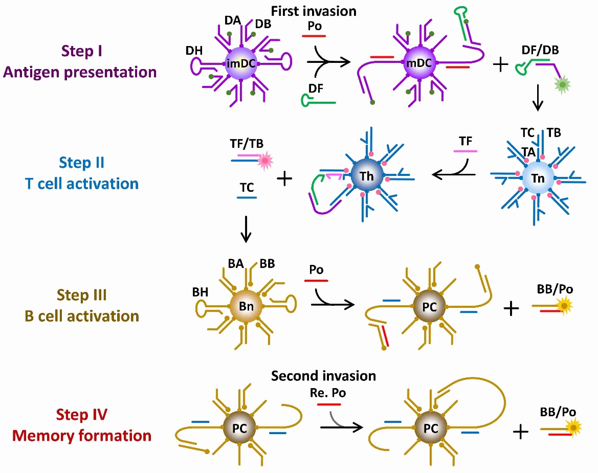 伟德国际1946生物反应器工程国家重点实验室叶邦策教授课题组通过模块化设计DNA分子机器,开发了一种多DNA机器交互网络系统,成功模拟了脊椎动物获得性免疫系统中细胞与细胞间通讯对病原体的识别,清除以及记忆。通过三种DNA分子机器分别模拟关键免疫细胞:树突状细胞(DC)、T细胞和B细胞,生动地展示了病原体侵袭过程中DC细胞,T淋巴细胞和B淋巴细胞的连续激活、抗体分泌、记忆形成和快速高效的二次应答。