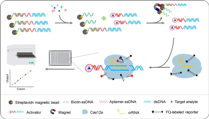 生物反应器的细胞优化、工艺和工程放大、甚至临床疾病诊断等多个场景都离不开嗅觉高效灵敏的生物传感与检测等通用平台技术。聚焦“绿色智能制造”这一目标,我校生物反应器工程国家重点实验室(以下简称国重室)张立新教授团队及其合作者利用CRISPR-Cas12a技术建立了针对小分子化合物的简单快速、灵敏、高通量和低成本检测平台,简称CaT-Smelor猫嗅技术(Nat Commu, 2019, 10: 3672)。为进一步扩展其通用性,该研究耦合CRISPR-Cas12a与核酸适配体,开发了升级版第二代检测平台CaT-Smelor 2.0,大幅扩展了底物检测类型,还可实现蛋白质等多种检测物的传感与高效检测。相关研究论文“A versatile biosensing platform coupling CRISPR–Cas12a and aptamers for detection of diverse analytes”于9月6日在Science Bulletin期刊在线发表(链接: https://doi.org/10.1016/j.scib.2020.09.004)。