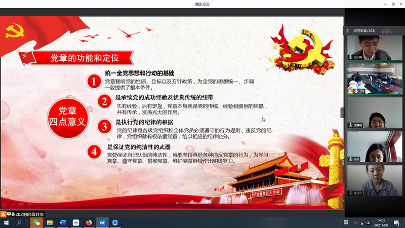 2月8日下午,在实验室十八楼202室,支部进行了党课理论学习,党课内容主要分为三个部分:学习党章党规、学习十九届五中全会精神、学习习近平总书记考察上海系列讲话。首先由高猛峰同志带着大家系统地学习了《中国共产党章程》,深入地讲述了其历史沿革,尤其是党的十九大对党章修改的具体内容以及关于习近平新时代中国特色社会主义思想等最新党章内容作了详释。接着由梁心怡同志带领全体同志观看并学习了习近平总书记考察上海重要讲话的相关视频资料。随后邓琳琳同志就十九届五中全会的关键词进行了相关解读,恰值“两个一百年”奋斗目标的历史交汇期,十九届五中全会具有重要意义,学习十九届五中全会精神对于广大党员同志尤为重要。最后,赵黎明老师就本次党课学习做了总结发言,并对支部2021年度党建活动做了指导。赵黎明老师强调,作为青年学生党员,其一要坚守初心和使命,把学党史、学党章、抓党建与促中心工作深度结合,结合自身实际,为锻造社会所需的科研人才、产出更多社会需要的科研成果而努力。其二要切实发挥好模范带头作用,形成党支部战斗堡垒,带领实验室同学们共同进步,提升综合素养;其三要认真学习,内外兼修,抓住历史的机遇,创造出彩人生!