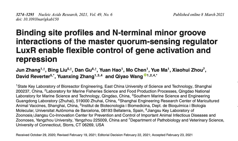 人与人之间可以通过语言、表情和动作进行交流。细菌菌体之间也能进行互相交流通讯,实现细菌的“社会性”行为,实现它们的共同目标,包括生物被膜、生物发光、运动性、营养代谢、毒力调节和环境适应性等。这种菌群交流通讯的机制称为群体感应 (Quorum sensing, QS) 系统。在海洋弧菌中存在复杂的群体感应系统,介导进行细菌种内和种间、细菌-藻类、细菌-动物宿主等多种信号交流机制,最终通过TetR家族的中枢调控元件LuxR蛋白同步控制下游多达600多个QS基因的表达,产生菌群行为。人们对LuxR蛋白同时调控诸多基因表达的机制一直不清楚。4月6日,国际知名的生化与分子生物学学术期刊Nucleic Acids Research发表了我校bevictor伟德国际1946王启要教授课题组深入研究海洋弧菌LuxR能够高度灵活地激活或抑制众多靶基因表达的分子机制,阐明了病原弧菌如何感知菌群密度或其他理化信号进行协同调控群体行为、导致病害暴发的重要而基础的科学问题。