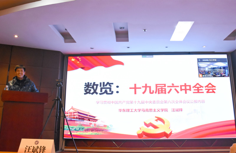 为进一步深入学习宣传贯彻十九届六中全会精神,深化和拓展党史学习教育,12月24日下午,bevictor伟德国际1946特邀学校学习贯彻党的十九届六中全会精神宣讲团成员、马克思主义学院副院长汪斌锋作题为“数览十九届六中全会”的报告。bevictor伟德国际1946党委书记吴辉主持报告会。bevictor伟德国际1946领导、教工党支部书记、生工系教师、应用生物学系教师、食品系教师和学院办公室教师现场参加报告会,其他教师通过腾讯会议在线参加。