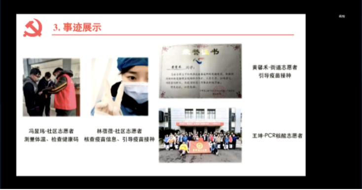 上海进入抗疫“最关键、最吃劲”阶段,疫情就是命令,防疫就是责任。会上党员同志从自身实际出发,讨论并交流在当前特殊阶段,如何更好地响应国家号召,发挥党员作用,履行初心使命。生工系教工党支部的夏杰说到,上海市疫情正处于高峰期,各位党员同志要时刻关注最新动态,作为党员要冲锋在前,善于发现问题,勇于提出问题,敢于解决问题,做好表率。来自国重室研究生第四党支部的王坤迅速响应国家号召和人民需求,主动报名伟德国际1946第二批PCR检测志愿者,现已随队出征,正在一线实验室。王坤表示,很荣幸能为上海市疫情防控贡献出华理力量,虽然前线的工作很辛苦,但志愿者们敢吃苦能吃苦,大家团结一致,必将打赢这场硬仗。由于现在上海市防控形势仍然复杂严峻,他表示,作为一名党员必须以身作则,遵守纪律,服从命令,坚持就是胜利,坚持才能胜利。生物学与食品科学硕士奉贤党支部的王奕嘉同志分享了在学校封控管理期间,她与室友一起解压放松的方式,虽然很遗憾不能奔赴前线,但会在后方传播正能量。