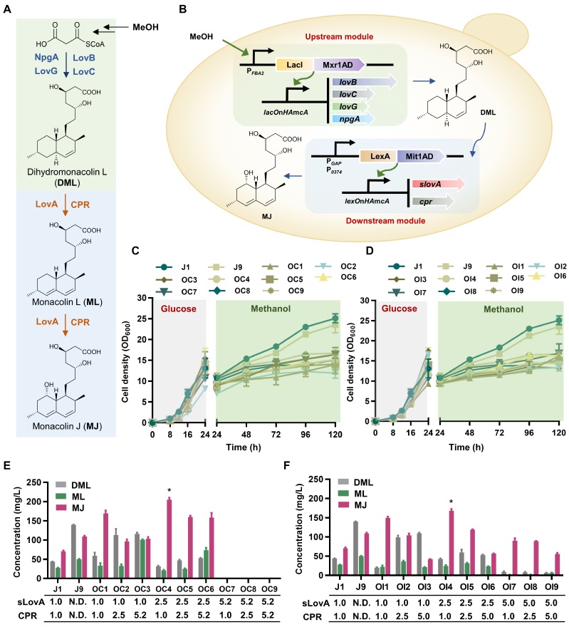 在此基础上,作者选用降血脂上市药物中间体莫纳可林J作为报告化合物,进一步检验了人工转录器件库cTRDL和iTRDL在复杂药物分子合成途径重构和调控中的应用成效。以甲醇为底物,选择iTRDL来源的器件适配平衡上游的聚酮合成模块,通过正交设计成功实现中间产物二氢莫纳克林L的高效合成,产量和产率达到相同培养条件和相同基因剂量下PAOX1表达模式的5.5倍和9.3倍。进一步,选择cTRDL和iTRDL来源的器件分别适配平衡下游氧化过程模块,通过全因子设计对整个途径的6种关键酶进行优化适配和非交互调控,最终实现了模块内和模块间的优化平衡,大幅度提升了目标产物莫纳可林J的合成能力,产量和产率达到相同培养条件和相同基因剂量下PAOX1表达模式3.0倍和5.0倍,且优于PAOX1表达模式的多拷贝基因剂量优筛菌株的产物合成能力,展现了作者所构建的人工器件库的精细调控、灵活可控、高效表达的特性。