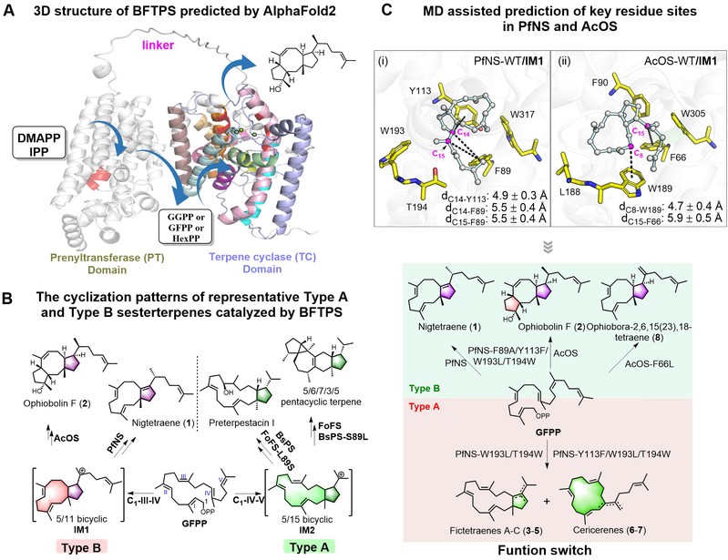 图片说明:真菌来源的双功能萜合酶(A&B)及分子动力学模拟辅助预测萜类环系演化关键氨基酸位点调控PfNS和AcOS催化功能转化(C)