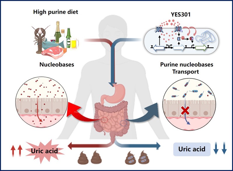 高尿酸血症是一种常见的嘌呤代谢障碍所致的慢性代谢性疾病,易引发痛风及慢性肾病等各种并发症,但目前治疗药物的作用靶点主要集中在肾脏,往往会导致严重的副作用。因此,亟需开发安全有效的预防和治疗新策略。痛风是因尿酸水平过高导致尿酸结晶沉积在关节内而引发的一种疾病,饮食中的嘌呤一经摄入,会通过肠道吸收,通过肝脏和肾脏代谢产生尿酸。因此,该研究利用益生菌中的嘌呤转运系统,将肠道中的嘌呤转运至益生菌胞内,并携带出体外,以此降低宿主对嘌呤的吸收,为有效防止高尿酸血症的发生提供了一个全新的策略。
