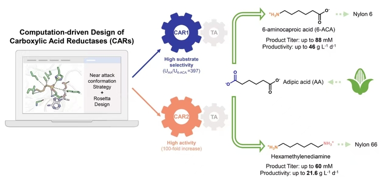 近日,我校生物反应器工程国家重点实验室许建和教授团队郁惠蕾教授课题组利用人工智能赋能的蛋白质理性设计技术重塑了羧酸还原酶的活性中心,大幅提升羧酸还原酶的活性和底物专一性,并成功应用于尼龙6和尼龙66的单体(1,6-己二胺和6-氨基己酸)的生物合成中。研究成果以“Computation-driven redesign of an NRPS-like carboxylic acid reductase improves activity and selectivity”为题,发表于Science子刊Science Advances上。